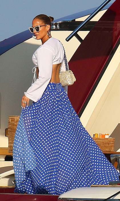 The singer-actress and her fiancé Alex Rodriguez were spotted boarding a yacht in Saint Tropez on Sunday on their way to celebrate Magic Johnson’s 60th birthday at Nikki Beach in the French coastal town. The 50-year-old star looked glam as ever wearing a white boat neck crop top and an ultra-fab blue and white polka dot skirt by Caroline Constas called the Hera.